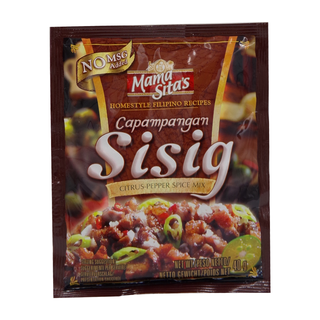 Mama Sita’s Capampangan Sisig citrus-pepper spice mix: Good mix powder when making sisig dish. Sisig is a Filipino dish made from part’s of a pig’s face and belly, and chicken liver which usually seasoned with calamansi(citrus), onions and chili pepper. The dish name comes from “sisigan” an old Tagalog word which means “to make it sour”.