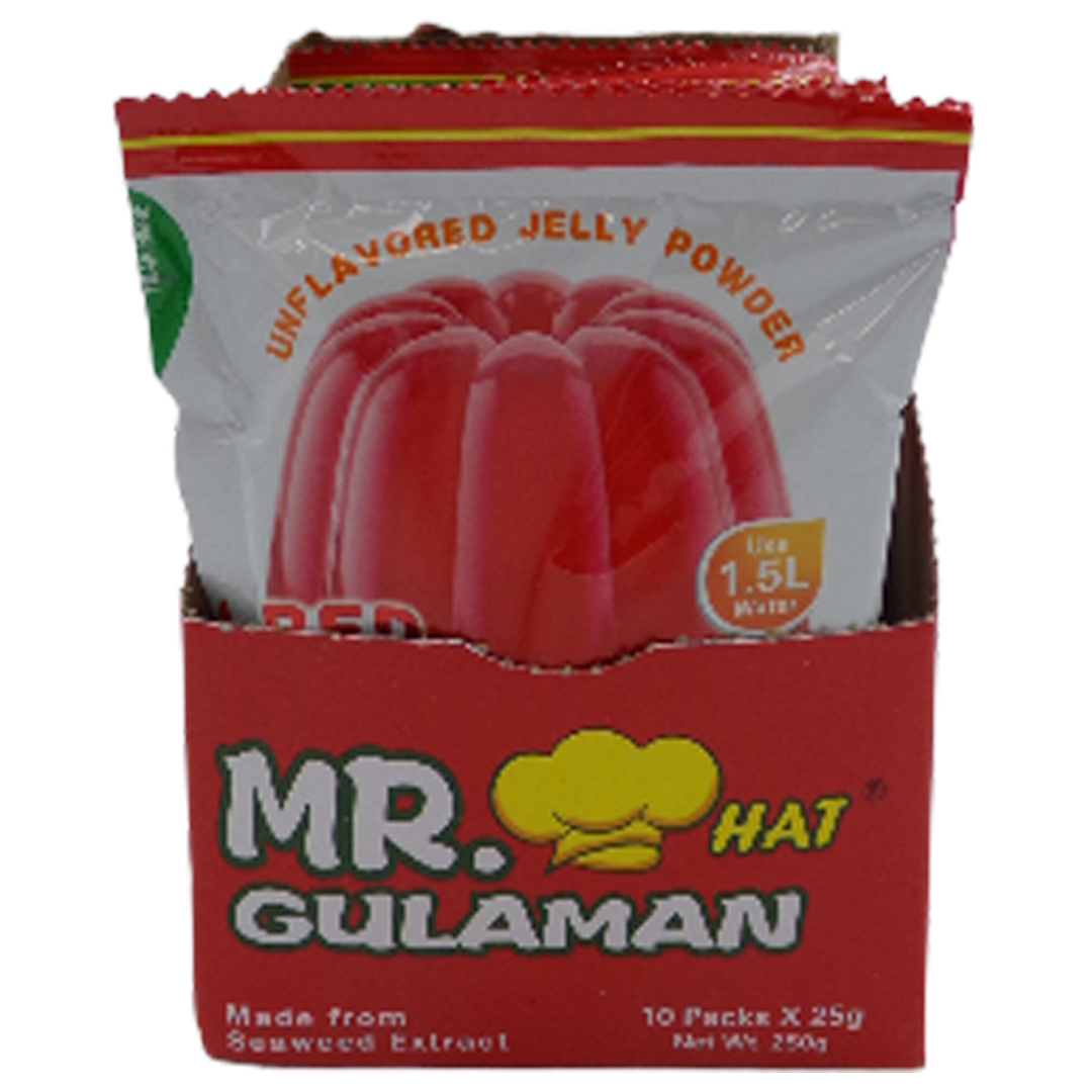 Mr. Gulaman Red is a powdered dessert mix for making red-colored jelly, derived from seaweed (agar-agar) and typically containing sugar and red food coloring. It is unflavored or has a strawberry flavor, depending on the specific brand (such as Mr. Hat or Mr. Wow), and creates a firm yet tender jelly when mixed with water and boiled. It’s a convenient and versatile ingredient for various Filipino desserts and other culinary creations.Nutrition: